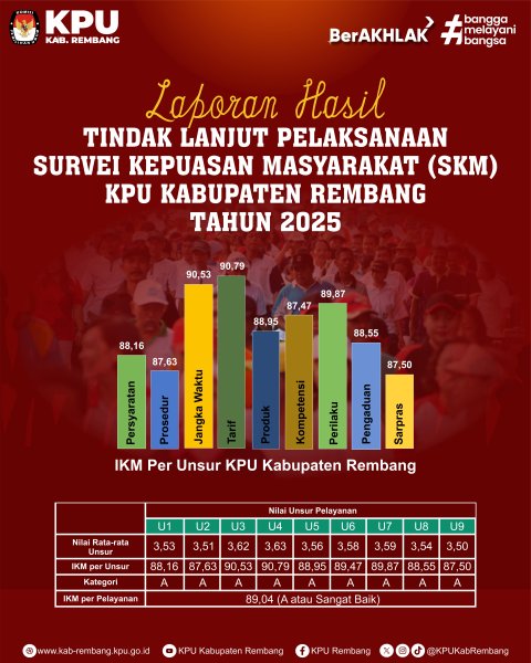#TemanPemilih Berikut adalah laporan hasil tindak lanjut pelaksanaan survei kepuasan masyarakat (SKM) KPU Kabupaten Rembang Tahun 2025.