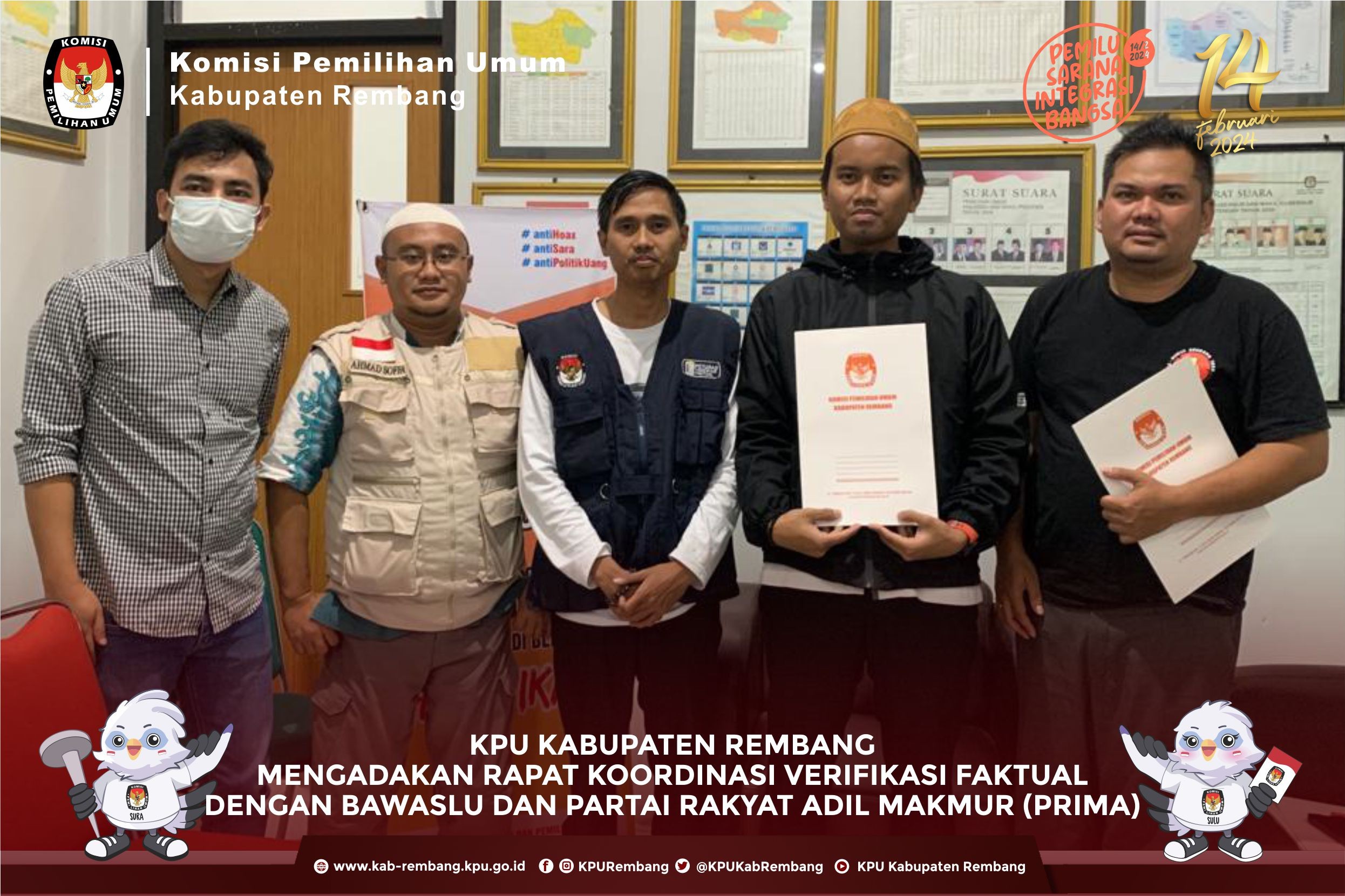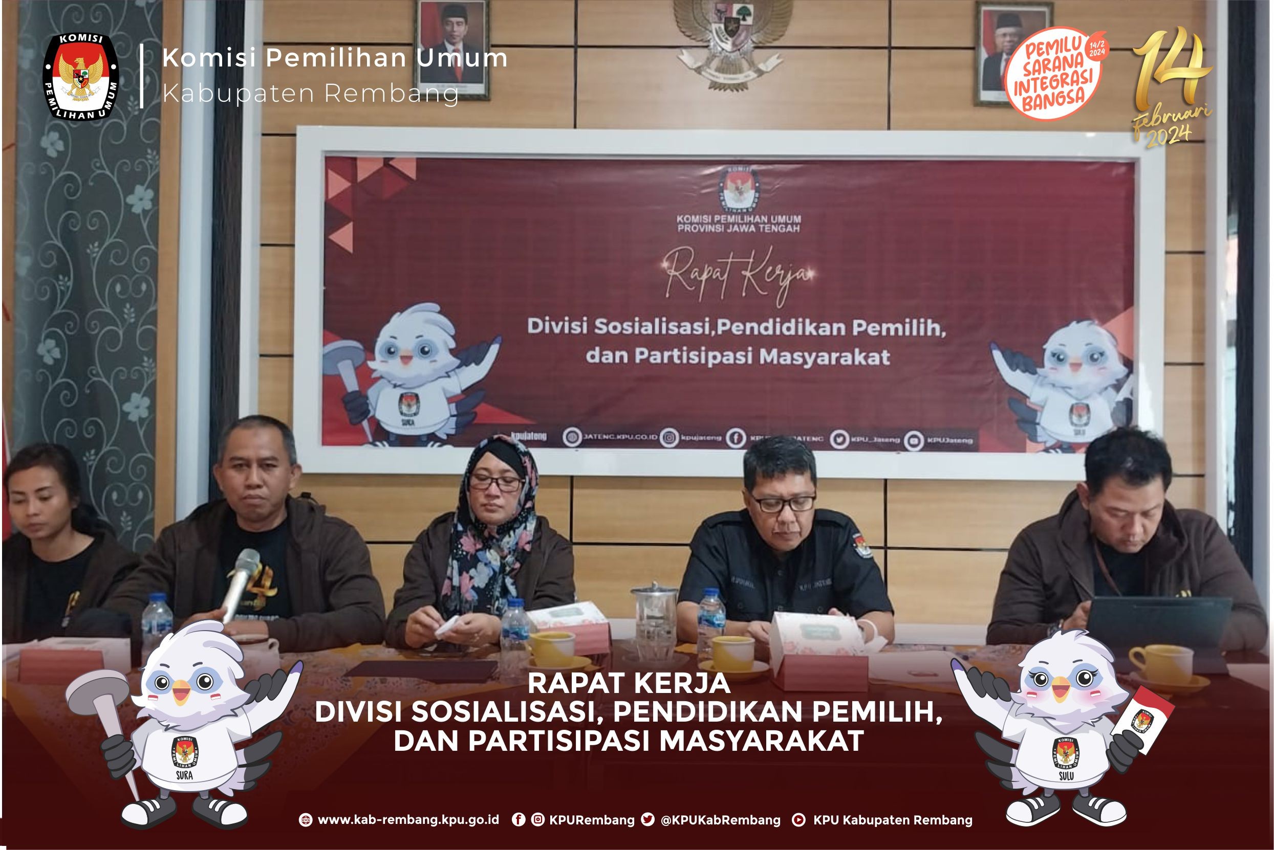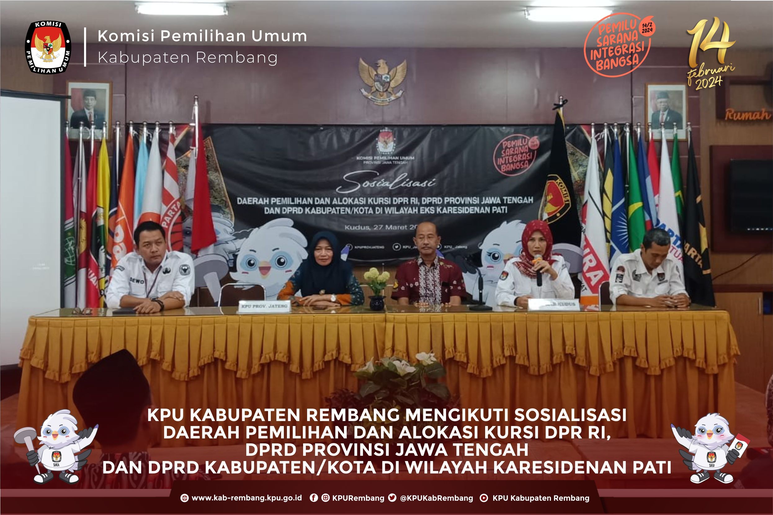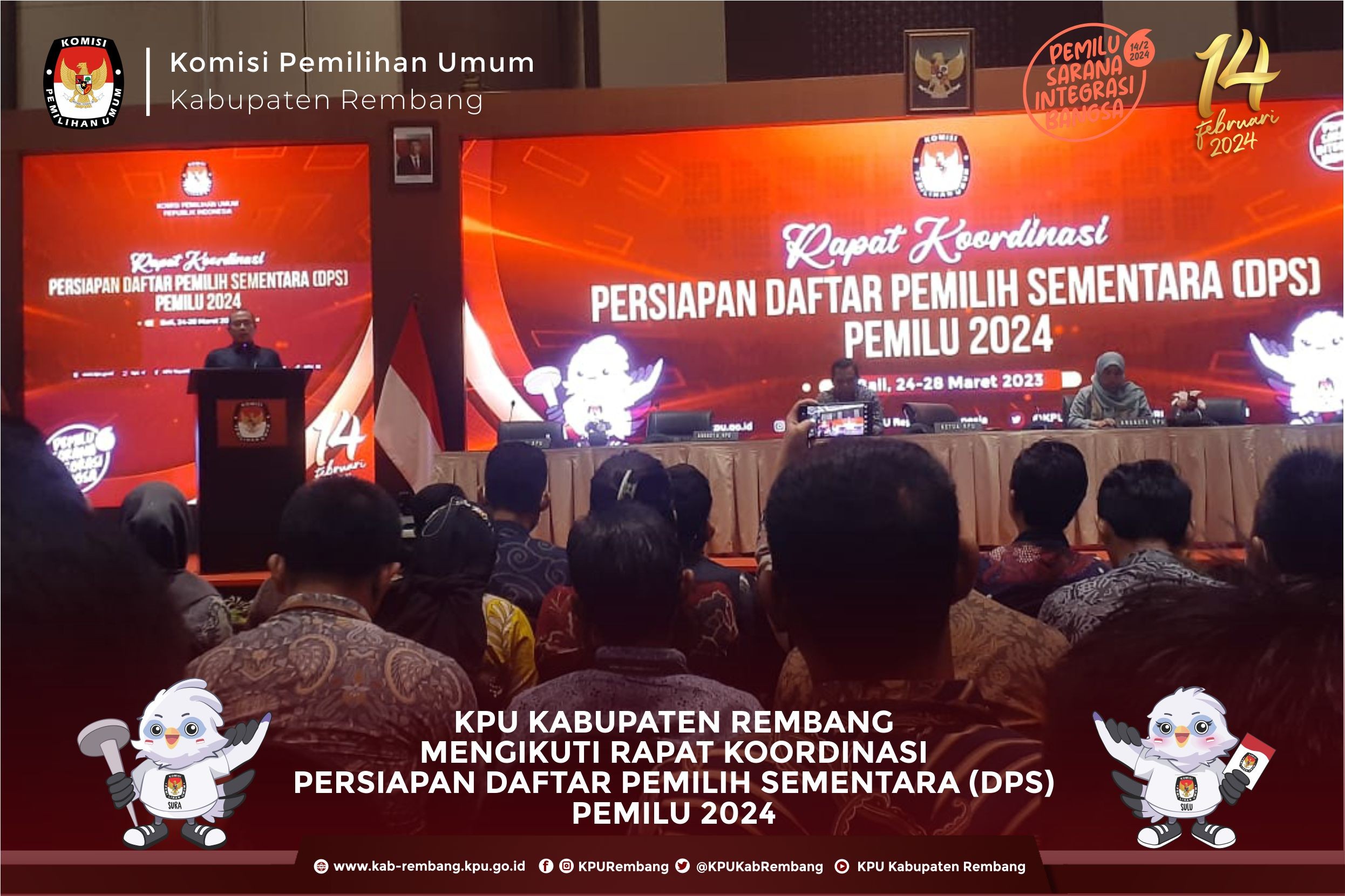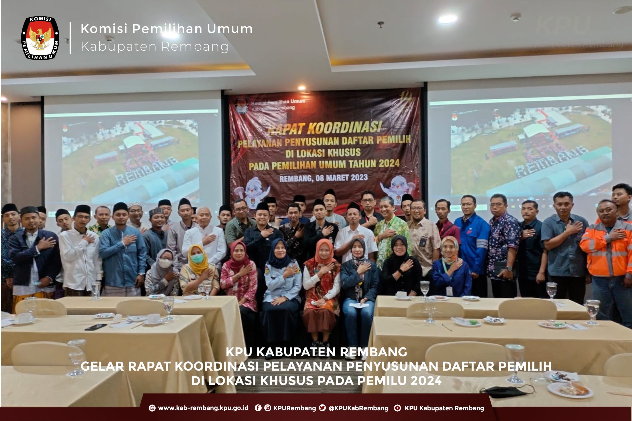 Komisi Pemilihan Umum Kabupaten Rembang melaksanakan Rapat Koordinasi Persiapan Rekapitulasi Daftar Pemilih Hasil Pemutakhiran (DPHP) pada Pemilu Serentak Tahun 2024 dengan PPK Se Kabupaten Rembang, Rabu (29/3).di Kantor KPU Rembang, kegaiatan ini di hadiri dan dibuka oleh Ketua KPU Provinis Jawa Tengah Bp Paulus Widiyantoro Dalam sambutannya, Ketua KPU Provinsi Jawa Tengah mengatakan, tugas penyusunan daftar pemilih merupakan pekerjaan mulia dengan tujuan untuk memastikan Warga Negara Indonesia (WNI) yang memiliki hak politik dapat menyalurkan suaranya di pemilu, sehingga sebelum dilaksanakannya Pleno teman – teman PPS untuk memastikan lagi apakah ada pemilih di wilayah PPS masing – masing yang belum terdaftar. "KPU memiliki tugas mulia untuk memastikan setiap warga negara yang memiliki hak pilih dan yang memenuhi syarat sebagai pemilih sudah terdaftar dalam daftar pemilih," kata Paulus. KPU Provinsi Jawa Tengah mengapresiasi teman – teman badan adhoc semua karena telah bekerja keras untuk menghasilkan data pemilih yang baik. Rakor tersebut bertujaun untuk melakukan sinrkonisasi data pemilih yang telah dilakukan oleh PPS di kabupaten Rembang Dengan sinkronisasi tersebut diharapkan bisa menghilangkan data pemilih ganda antar kabupaten/kota maupun antar provinsi. #KPUmelayani #PemiluSerentak2024
