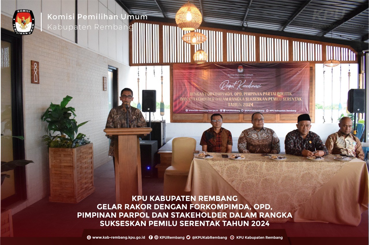 kab-rembang.kpu.go.id-KPU Kabupaten Rembang menggelar Rapat Koordinasi (Rakor) Persiapan Pemilu dan Pemilihan Serentak Tahun 2024, di Hotel Pollos Rembang (11/11) sore kemarin. Rakor dihadiri Wakil Bupati Rembang, Moch. Hanies C.B., Sekda Rembang Fahrudin, Perwakilan Kapolres Rembang, Perwakilan Komandan Kodim 720 Rembang, Ketua DPRD Rembang, Kepala Kejaksaan Negeri Rembang, dan Kepala Pengadilan Negeri Rembang.