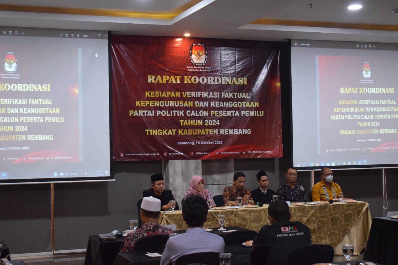 “Jadi, KPU Kabupaten Rembang akan melaksanakan verifikasi faktual kepengurusan dan keanggotaan dimulai tanggal 15 Oktober-4 November, sehingga dibutuhkan koordinasi semua pihak,” ujarnya.