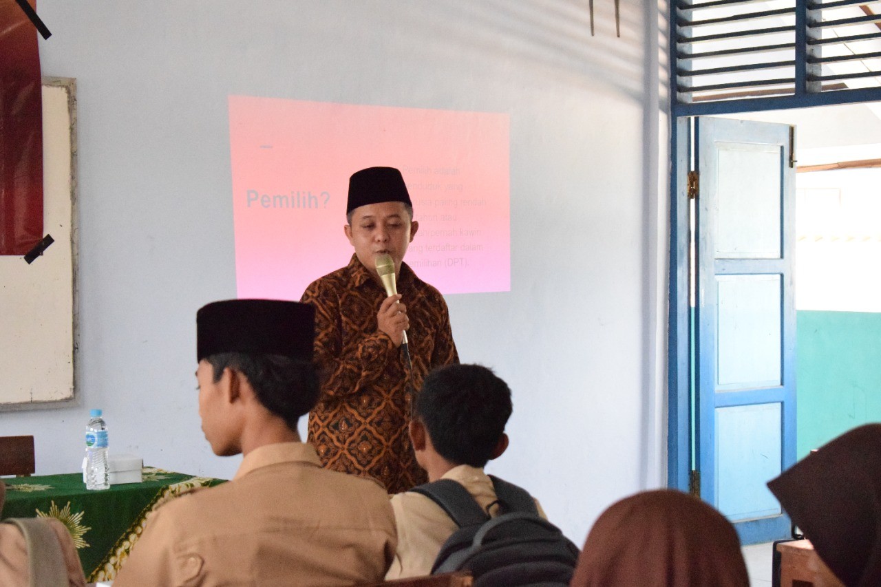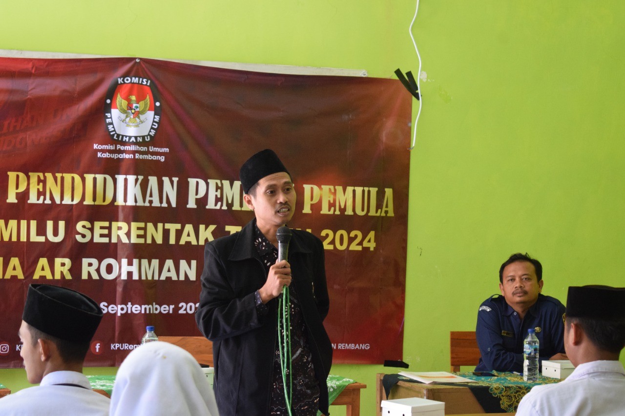 kab-rembang.kpu.go.id-KPU Kabupaten Rembang kembali menggerlar Sosialisasi Pendidikan Pemula di MA Ar-Rohman 1 Bulu (27/09) Kegiatan dibuka oleh Kepala Sekolah MA Ar-Rohman 1 Bulu yang menyampaikan harapannya agar anak-anak tertarik untuk belajar demokrasi dan lebih kritis ketika menjadi pemilih pada Pemilu Tahun 2024. "Saya merasa bangga KPU berkenan hadir di MA Ar-Rohman 1 Bulu, harapannya anak-anak terbuka wawasannya akan ilmu yang baru terkait demokrasi dan kepemiluan " Selanjutnya materi dalam kegiatan ini disampaikan oleh Divisi Teknis Penyelenggaraan, Moh. Zaenal Arifin yang menjelaskan pengetahuan dasar tentang pemilih pemula dan pelaksanaan tahapan pemilu serentak 2024, akan dilaksanakan pada hari Rabu Tanggal 14 Februari 2024 mendatang "Dalam pemilihan yang akan datang ini akan memilih 5 pemimpin yaitu Presiden serta Wakil Presiden, anggota DPR RI, anggota DPRD Provinsi, DPRD Kabupaten/kota dan DPD, pemilih pemula atau yang baru memiliki KTP atau baru pertama mengikuti pemilihan agar dapat menentukan hak pilihnya masing-masing sesuai hati nurani". Pada akhir acara KPU Kabupaten mengajak para siswa untuk berdiskusi dan foto bersama. (Humas KPU Kabupaten Rembang)