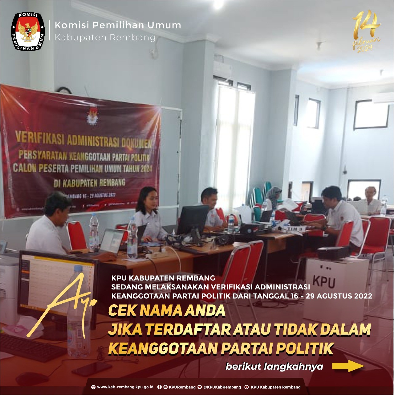 Sesuai dengan arahan KPU RI, KPU Kabupaten Rembang mengklarifikasi langsung partai politik (Parpol) calon peserta Pemilu 2024 yang memiliki keanggotaan ganda eksternal pada hari pertama, 4 September 2022. Divisi Teknis Penyelenggaraan KPU Kabupaten Rembang, Zaenal Arifin mengatakan hari ini KPU Kabupaten Rembang sudah mengirimkan surat pemberitahuan kepada petugas penghubung Parpol untuk menghadirkan anggota Parpol yang memiliki status keanggotaan ganda dengan parpol lain dan belum dapat ditentukan keanggotaannya karena kedua parpol telah mengunggah surat pernyataan pada Sipol. “Dari hasil tindak lanjut oleh Parpol terkait keanggotaan ganda eksternal yang belum dapat dipastikan keanggotaannya karena kedua parpol menggunggah surat pernyataan pada Sipol, maka kami akan meminta partai politik untuk menghadirkan orang bersangkutan ke Kantor KPU Kabupaten Rembang guna dilakukan klarifikasi langsung pada 4-5 September 2022," jelasnya. Ia menambahkan penjelasan bahwa hari ini telah hadir dua anggota dari salah satu Parpol yang memiliki keanggotaan ganda dengan parpol lain. “Hari ini saya didampingi dengan Divisi Hukum KPU kabupaten Rembangg, Musoffa telah melakukan klarifikasi dua anggota parpol dan sudah dapat ditentukan status keanggotaannya”, katanya. (Humas KPU Kabupaten Rembang)