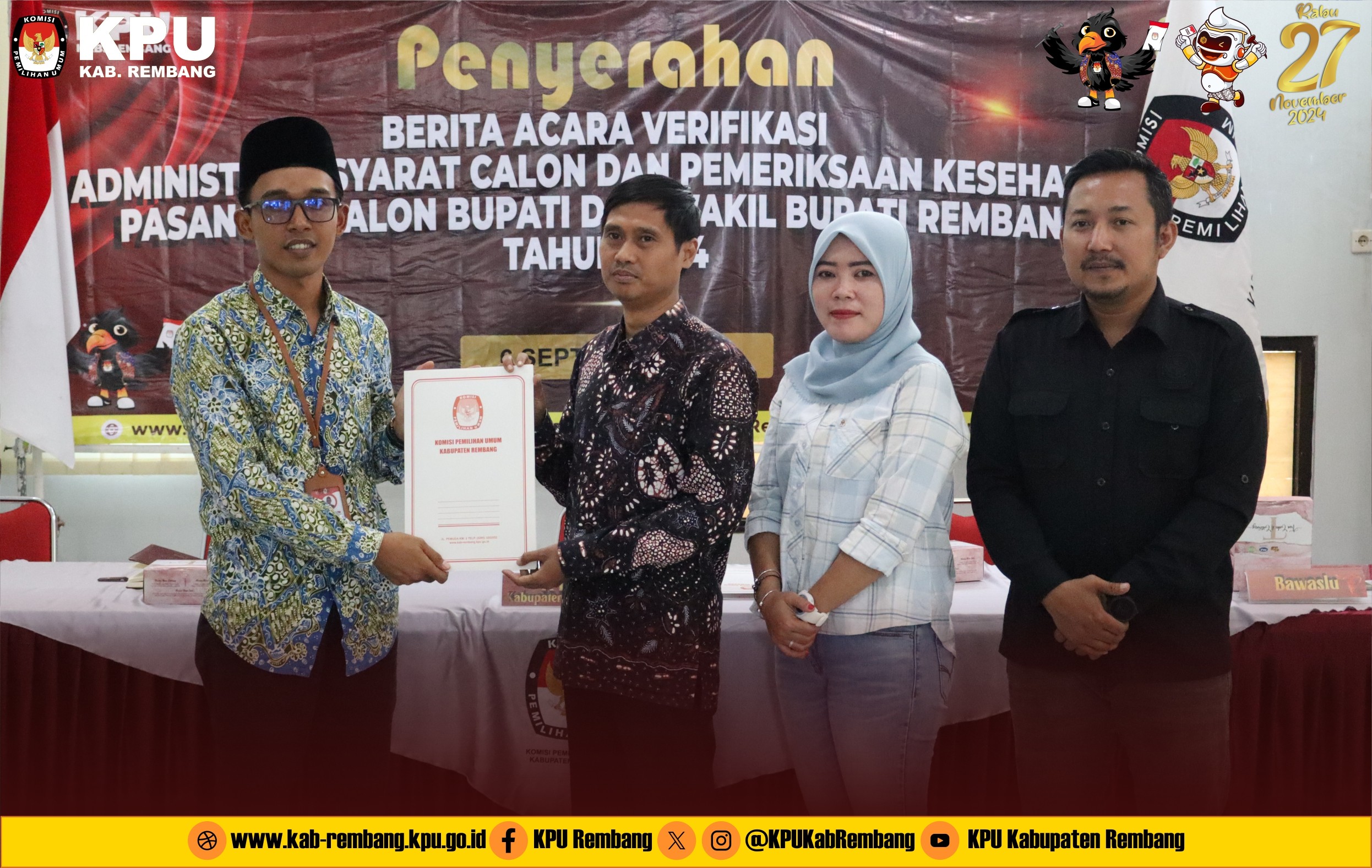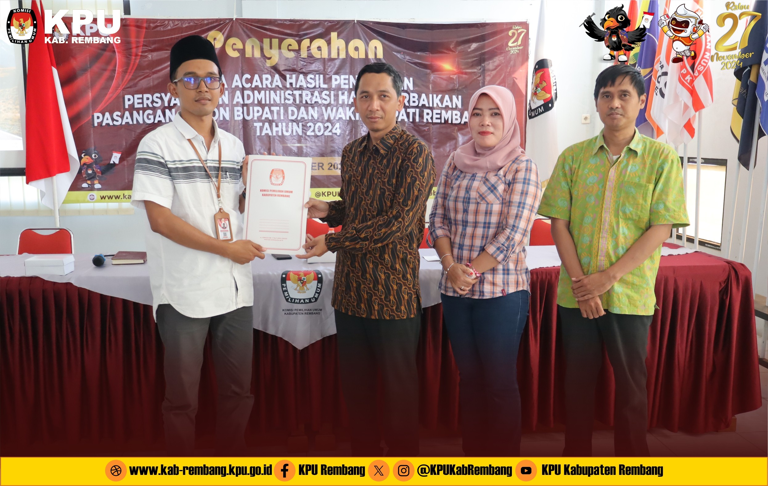 Bakal Pasangan Calon Bupati dan Wakil Bupati Harno dan Hanies Cholil Barro', beserta Gabungan Partai Politik Pengusul diterima langsung oleh Ketua dan Anggota KPU Kabupaten Rembang untuk menyampaikan berkas pendaftaran.