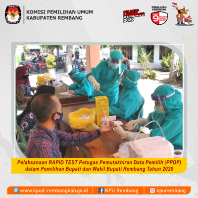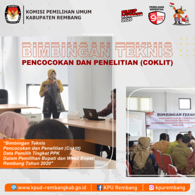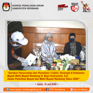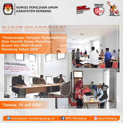 Rembang-KPU Kabupaten Rembang menggelar Rapat Koordinasi Persiapan Penelitian dan Pencocokan Data Pemilih (Coklit) bersama OPD (Organisasi Perangkat Daerah) dan Partai Politik pada hari Selasa, 14 Juli 2020 di Aula KPU Kabupaten Rembang sesuai dengan protokol kesehatan. Data pemilih merupakan elemen penting baik dalam Pemilihan Umum maupun Kepala Daerah. Untuk itu, ditengah pandemi Covid-19 pencocokan dan penelitian data pemilih harus digelar untuk menjaga kualitas penyusunan data pemilih yang akurat dalam Pemilihan Bupati dan Wakil Bupati Rembang Tahun 202o. Penelitian dan Pencocokan Data Pemilih yang akan dilaksanakan oleh Petugas Coklit dengan cara mendatangi rumah warga mulai tanggal 15 Juli hingga 13 Agustus 2020 sesuai dengan protokol kesehatan. Nantinya dalam melaksanakan tugasnya, Petugas Coklit akan menggunakan Alat Pelindung Diri dan melakukan tindakan pencegahan penyebaran Covid-19 seperti cuci tangan atau menggunakan hand hanitizer. (HumasKPURembang) [gallery columns="4" ids="6464,6465,6466,6467"]