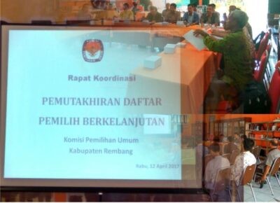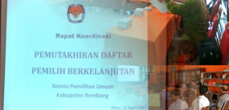 Rembang-Pada hari Rabu, 26 April 2017 KPU Kabupaten Rembang mengadakan rapat pleno mingguan dengan agenda Pemuktahiran Daftar Pemilih Berkelanjutan. Rapat pleno ini dihadiri oleh semua komisioner, pejabat sekretariat, notulen beserta operator. dalam rapat pleno ini KPU Kabupaten Rembang membahas tentang sosialisasi Pemuktahiran Daftar Pemilih Berkelanjutan. Sosialisasi akan dilakukan oleh KPU Kabupaten Rembang dengan memasang baliho, spanduk, dan pengumuman serta formulir tanggapan dan masukan masyarakat yang akan dipasang di tempat-tempat strategis di wilayah Kabupaten Rembang. Untuk itu KPU Kabupaten Rembang meminta bantuan kepada Pemerintah Kabupaten Rembang untuk menyampaikan pemasangan bahan sosialisasi berupa baliho, spanduk, dan pengumuman ini kepada Camat dan Kepala Desa/Lurah. Daftar pemilih seringkali menjadi persoalan pada saat pelaksanaan Pemilihan Umum Legislatif, Pemilihan Presiden dan Wakil Presiden maupun Pemilihan Kepala Daerah. oleh karena itu KPU RI memerintahkan segenap jajaran KPU secara berjenjang melakukan kegiatan Pemuktahiran Daftar Pemilih Berkelanjutan. Dalam rapat ini dibahas tentang penyebaran bahan sosialisasi pemuktahiran daftar pemilih berkelanjutan dengan harapan masyarakat Kabupaten Rembang proaktif untuk menyampaikan perubahan datanya kepada KPU Kabupaten Rembang. Diharapkan melalui kegiatan ini dapat tersusun daftar pemilih yang akurat dan akuntabel Form tanggapan ke KPU