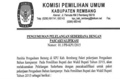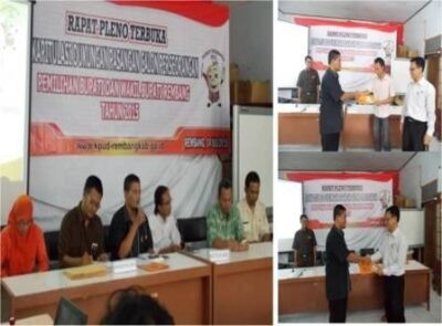 Selasa, 14 Juli 2015 KPU Kabupaten Rembang menyelanggarakan Rapat Pleno Terbuka Rekapitulasi Dukungan Pasangan Calon Perseorangan Bupati dan Wakil Bupati Rembang tahun 2015 tingkat kabupaten di Ruang Media Centre KPU Kabupaten Rembang. Rapat pleno dihadiri oleh tim penghubung pasangan calon perseorangan, Panwas Kabupaten Rembang, dinas terkait dan PPK sekabupaten Rembang.