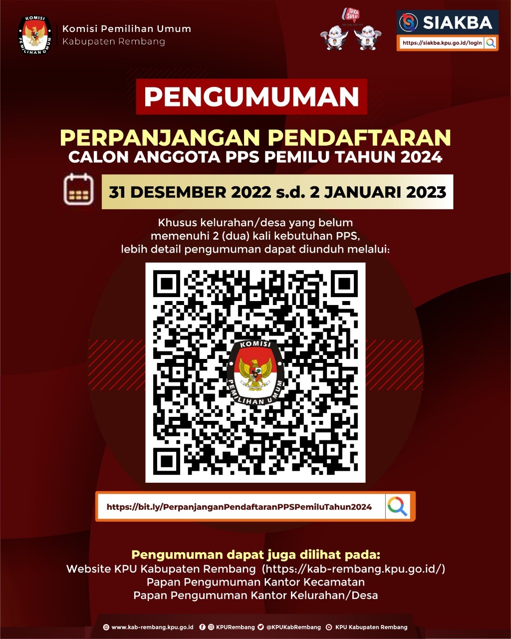 Pengumuman Perpanjangan Pendaftaram PPS Pemilu Tahun 2024 Sabtu, 31 Desember 2022 07:00 377 Pengumuman dapat diunduh pada klik Baca Selengkapnya