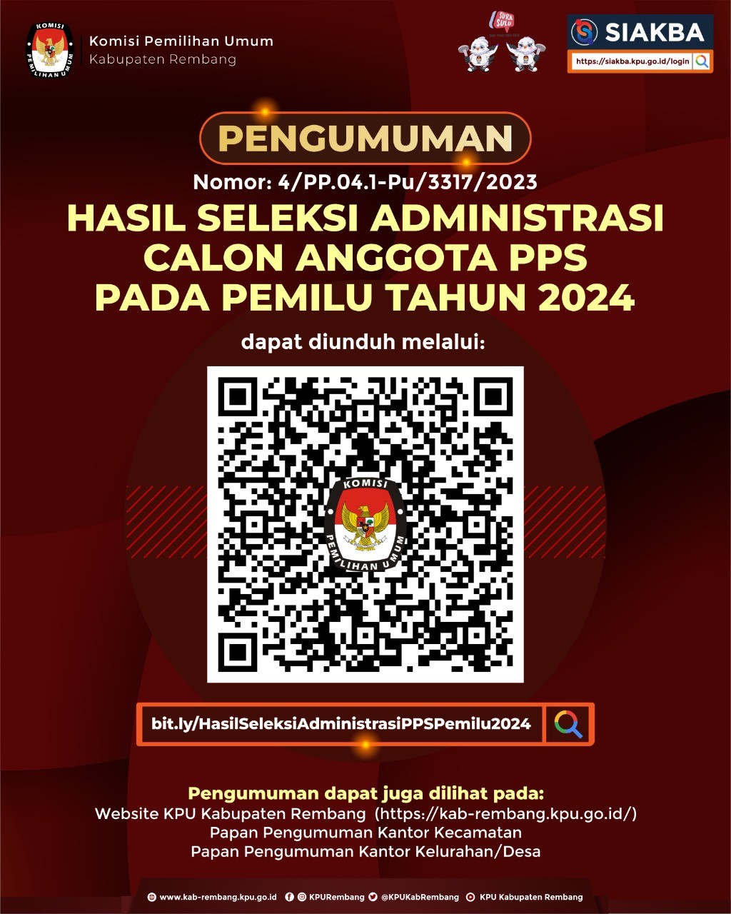 Pengumumann Hasil Seleksi Administrasi PPS Pemilu 2024 Jumat, 06 Januari 2023 07:00 568 Pengumumann Hasil Seleksi Administrasi PPS Pemilu 2024 dapat diunduh melalui klik Baca Selengkapnya