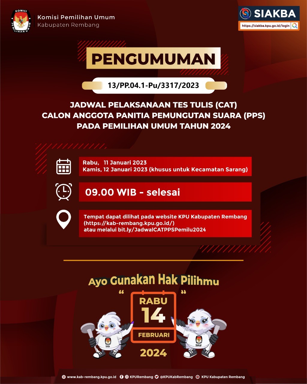Jadwal Pelaksanaan Tes Tertulis (CAT) Calon Anggota Panitia Pemungutan Suara (PPS) Pada Pemilu Tahun 2024 Senin, 09 Januari 2023 07:00 623 Jadwal Pelaksanaan Tes Tertulis (CAT) Calon Anggota Panitia Pemungutan Suara (PPS) Pada Pemilu Tahun 2024 dapat diunduh pada (klik) Baca Selengkapnya