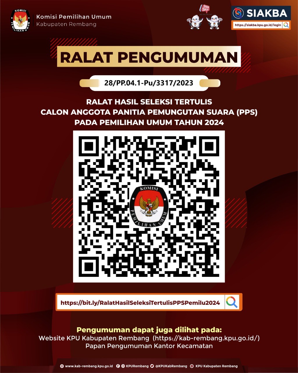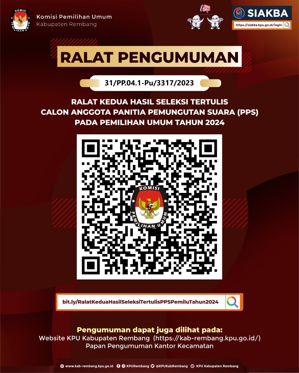 Ralat Pengumuman Hasil Seleksi Tes Tertulis Calon Anggota PPS Pemilu Tahun 2024 Minggu, 15 Januari 2023 19:00 950 Ralat Pengumuman Hasil Seleksi Tes Tertulis Calon Anggota PPS Pemilu Tahun 2024 dapat diunduh pada klik Baca Selengkapnya