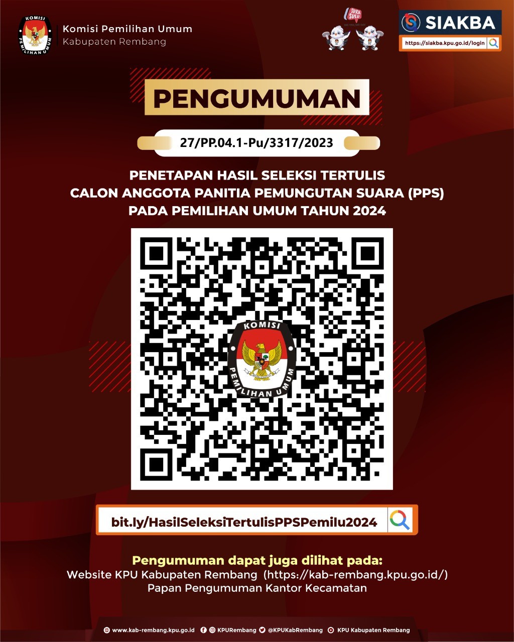 Pengumuman Hasil Seleksi Tertulis Calon Anggota PPS Pada Pemilu Serentak Tahun 2024 Minggu, 15 Januari 2023 13:00 373 Pengumuman Hasil Seleksi Tertulis Calon Anggota PPS Pada Pemilu Serentak Tahun 2024 dapat diunduh pada klik Baca Selengkapnya