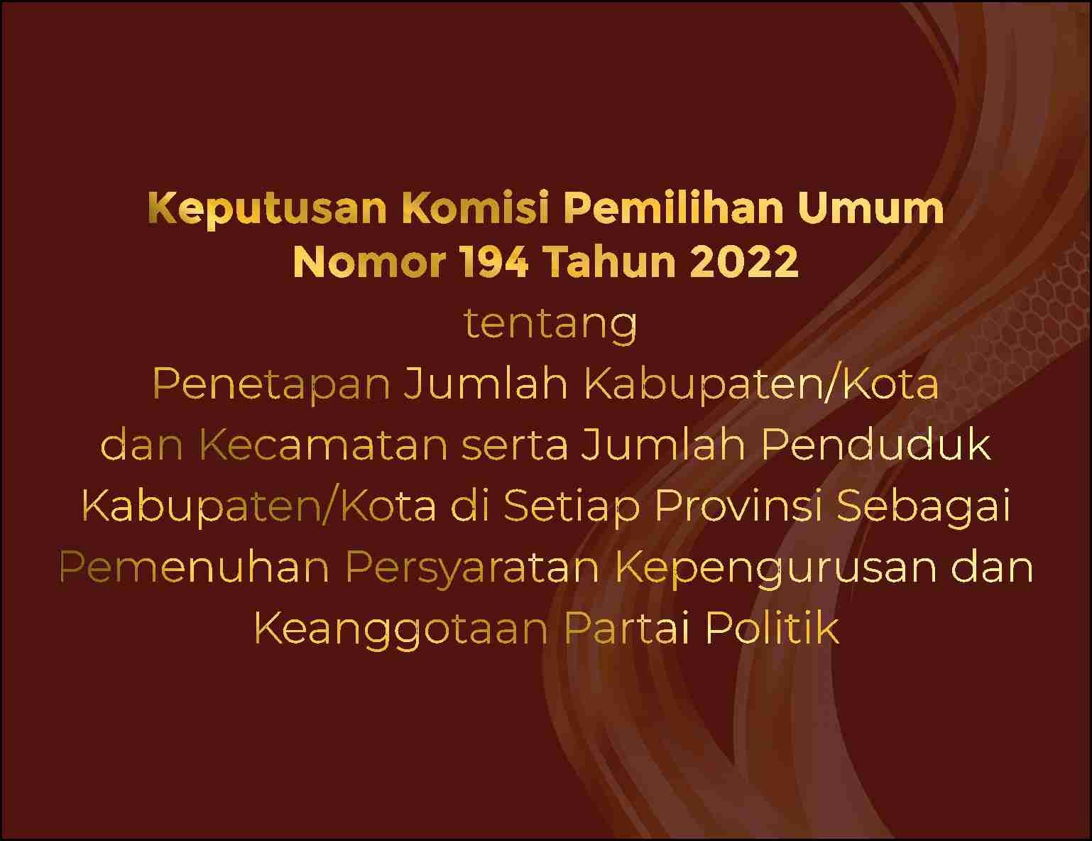 Keputusan Komisi Pemilihan Umum Nomor 194 Tahun 2022 tentang Penetapan Jumlah Kabupaten/Kota dan Kecamatan serta Jumlah Penduduk Kabupaten/Kota di Setiap Provinsi Sebagai Pemenuhan Persyaratan Kepengurusan dan Keanggotaan Partai Politik