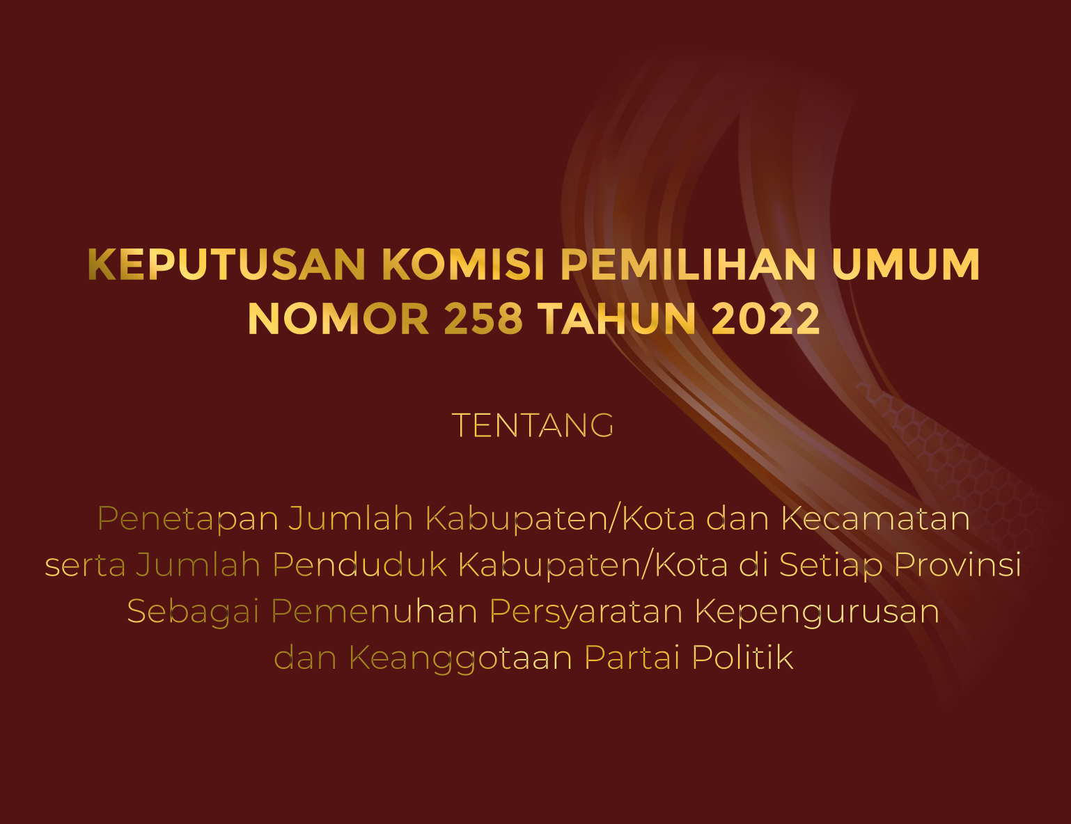 Keputusan Komisi Pemilihan Umum Nomor 258 Tahun 2022 tentang Penetapan Jumlah Kabupaten/Kota dan Kecamatan serta Jumlah Penduduk Kabupaten/Kota di Setiap Provinsi Sebagai Pemenuhan Persyaratan Kepengurusan dan Keanggotaan Partai Politik dapat diunduh melalui klik