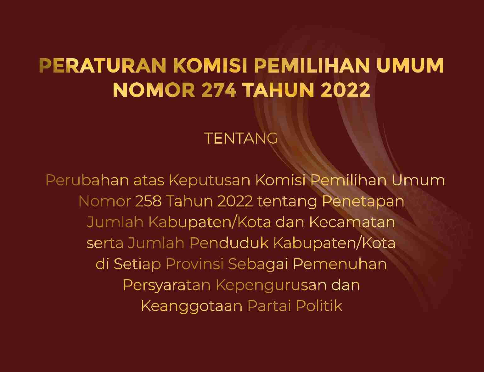 Keputusan Komisi Pemilihan Umum Nomor 274 Tahun 2022 tentang Perubahan atas Keputusan Komisi Pemilihan Umum Nomor 258 Tahun 2022 tentang Penetapan Jumlah Kabupaten/Kota dan Kecamatan serta Jumlah Penduduk Kabupaten/Kota di Setiap Provinsi Sebagai Pemenuhan Persyaratan Kepengurusan dan Keanggotaan Partai Politik dapat diunduh melalui klik